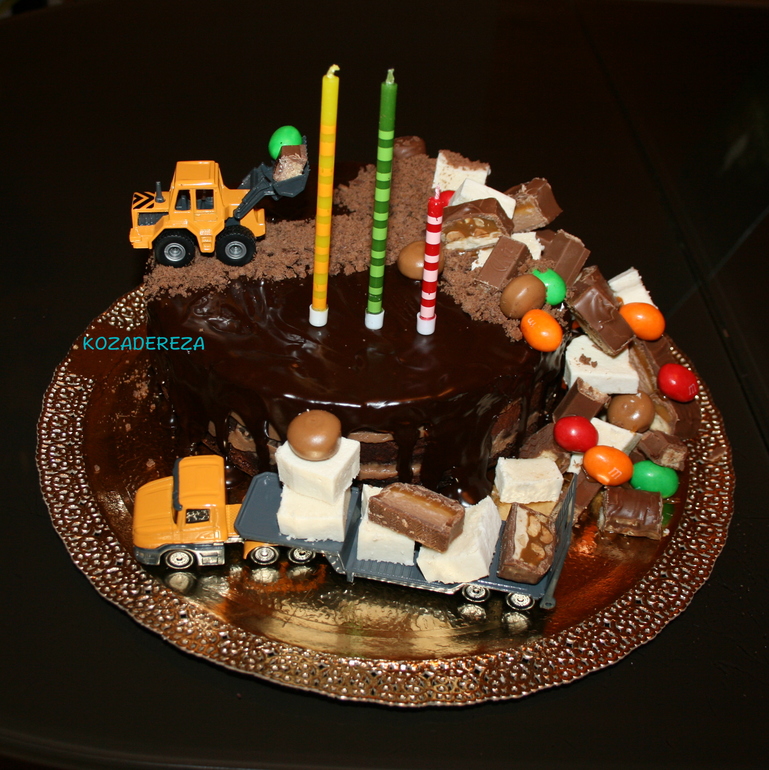 Внутри прага. С шоколадной глазурью. Декорации-сникерс-марс-твикс-пастила-ммдмс)))-миллер-киткат. Железные машинки(не было времени лепить из мастики). Ну и конечно две с половиной свечки