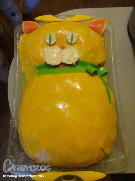 Голова у кота сделана из птичего молока с фруктами, а тело - бисквит.