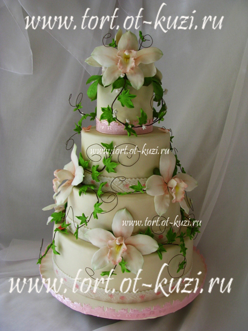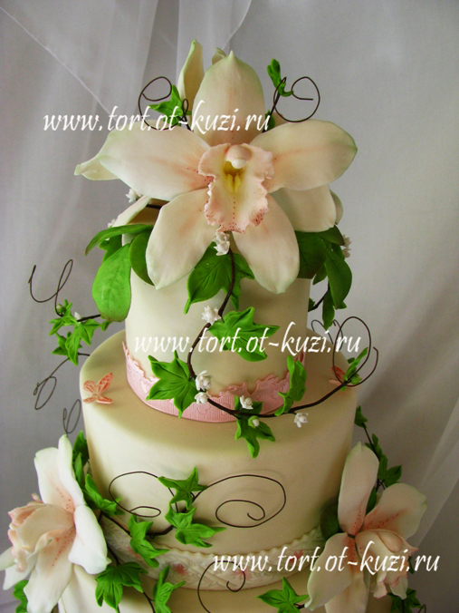 Торты на заказ4-хъярусный свадебный торт с сахарными орхидеями. Вес торта 14 кг. Нижний ярус - песочный с разными кремами (фрукты), 3-ий - карамельный бисквит с масленым кремом, 2- шоколадный бисквит со взбитыми сливками, 1-ый (самый верхний) шоколадно-трюфельный.