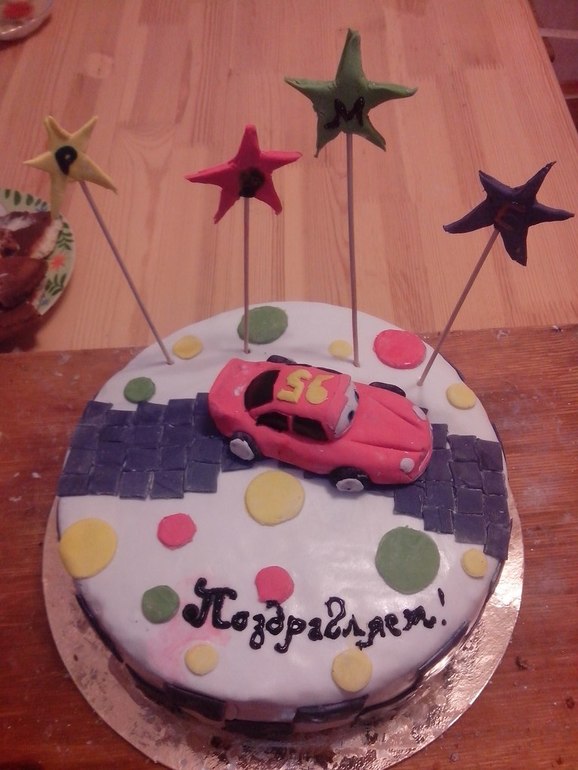 После обмазываем и выравнивает кремом под мастику. Обмазываем 1 слой кремом и в холодильник на 30 мин. Затем 2 слоем для усовершенствования торта. И снова в холод. Достаем....берём широкий нож и убираем тихонько лишнее обмакивая постоянно нож в горячей воде и вытирая его насухо салфеткой.Берём мастику раскатываем используя сах.пудру....иначе липнет,в толщину 3 мл. И покрываем наш торт,срезая внизу лишнее....аккуратно выравниваем.И уже по своей фантазии украшаем остатками мастики используя красители и свои золотые ручки.