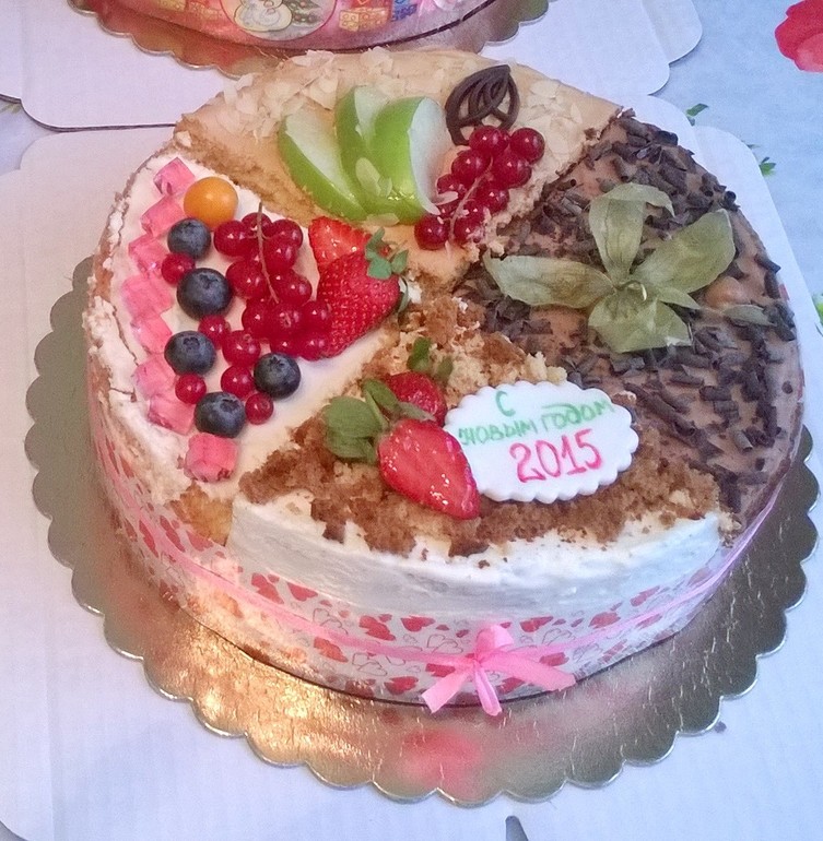 Вкусы такие - ванильный со сметанно-сливочным кремом и вишней; медовик с кремом-брюле, бананом и сгущеночной пропиткой; шоколадно-кофейный торт-мусс; бисквитная ягодная панна-котта. Вес- около 2,5 кг, цена - 2500 рублей.