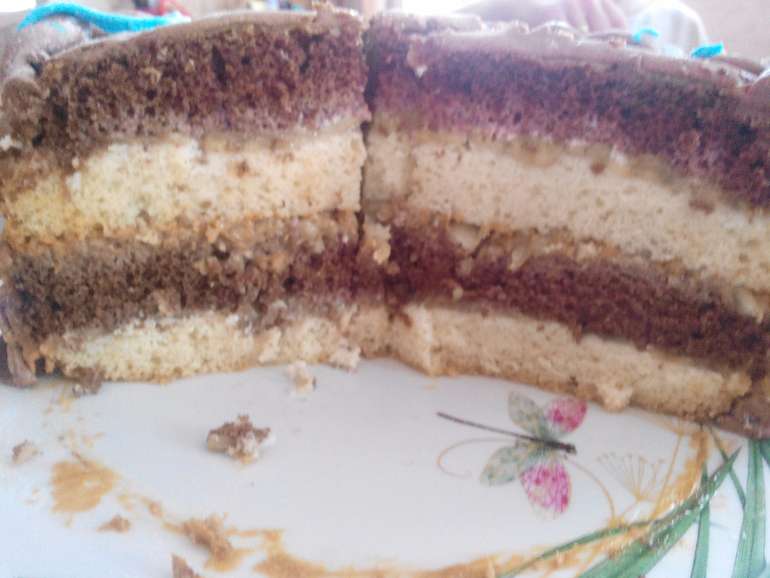 Внутри ванильные и шоколадные бисквиты, пропитаны сгущенкой, прослойки бананов и вареной сгущенки.