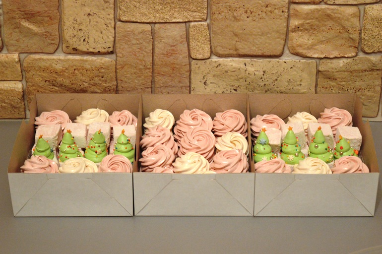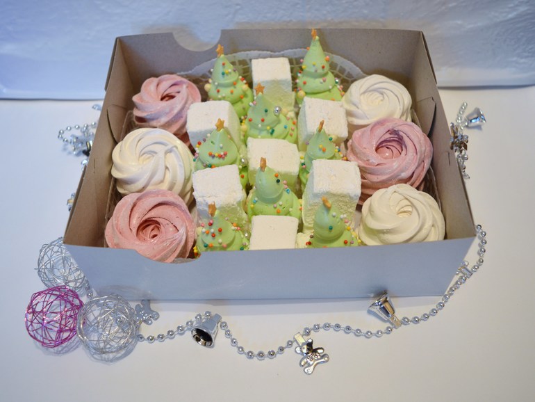Делала наборчики для благотворительной ярмарки, все вырученные средства пошли в фонд поддержки детей с онкологическими заболеваниями. Зефир клубничный и яблочно-абрикосовый, меренги - елочки и маршмеллоу с вишневым вкусом. И еще подобный наборчик на день рождения прекрасной девчушки (яблочный зефир, вишневый, меренги-елочки и ванильные маршмеллоу, фото ниже).