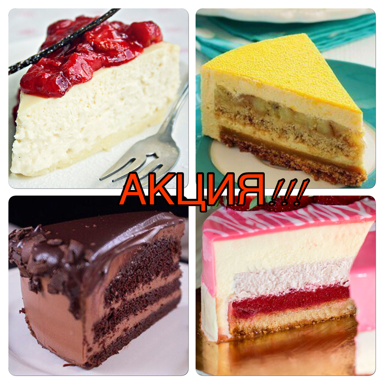 •банан-карамель. Состав: крамбл с фундуком,карамельный слой,банановый бисквит,банановый слой с кусочками спелого банана,карамельный мусс,карамельный гляссаж(покрытие). •шоколадный баварский торт. Шоколадные невероятные коржи , шоколадный мусс на горьком и молочном шоколаде и шоколадный ганаш. •муссовый клубничный торт. Состав: миндальный крамбл,клубничный чизкейк,клубничный конфи и лёгкий мусс с тонкой ноткой свежего лимона.