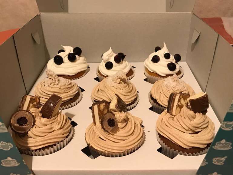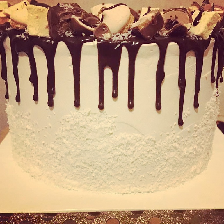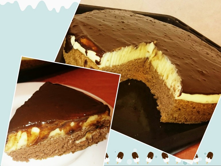 Здравствуйте, там взбитые сливки а сверху шоколадный глазурь и разные шоколадки.