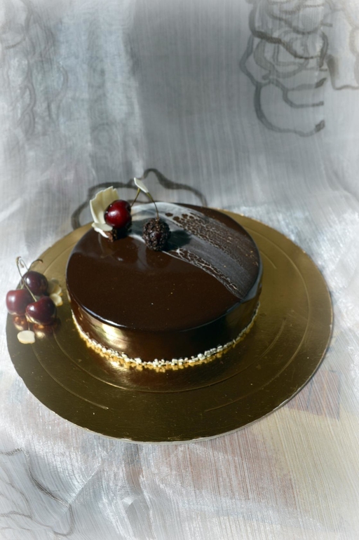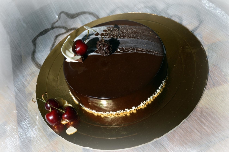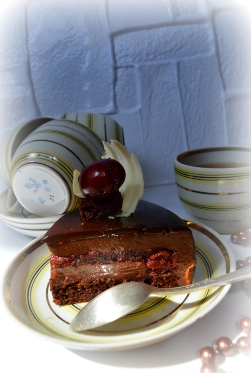 Торты на заказЗнаменитый "Чёрный лес" в муссовом исполнении, настоящая шоколадная бомба, просто рай до истинных ценителей и любителей. Изюминка торта - вишня, а точнее вишневое компоте, как царица восседающее на троне из элегантного шоколадного бисквита, замешанного на миндальной муке, в обрамлении пикантного ганаша на молочном шоколаде с Амаретто в облаке фантастического мусса на черном шоколаде с натуральной ванилью и звездочкой аниса ( в оригинале мусс с бобами Тонка, но их, как оказалось, их днем с огнем не сыщешь), а венчает всю эту композицию шоколадная зеркальная глазурь.