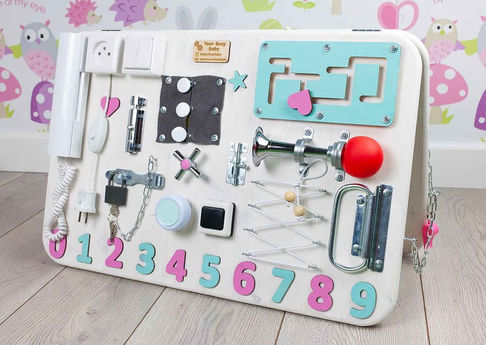 К развивающим игрушкам также относятся . Это такие стенды или объемные сооружения с разнообразными деталями. Изучение элементов бизиборда развивает творческое мышление, логические навыки, восприятие цвета, света, пространства. Такое занятие предполагает полную свободу: ребенок сам выбирает, за что сначала взяться, что покрутить, развязать, застегнуть или нажать… Это целое пространство для исследований!