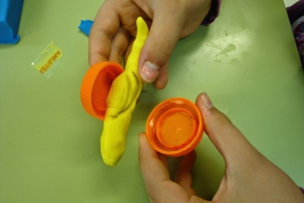 Очень простая поделка для самых маленьких. Тело улитки делается из пластилина или игрового теста, к которому просто с двух сторон прикрепляются крышки - улиткин домик.