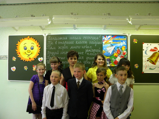 была торжественная часть, дети читали стихи, пели песни, получали "дипломы" о начальном образовании. Мы от родителей сказали благодарственное слово нашей первой учителдьнице. А потом была неофициальная часть - детская программа в ДК: