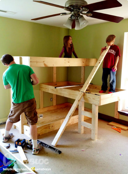 У меня муж сделал трехярусную кровать,когда Насте кроватка стала мала,да и Женя родилась.Только у нас все ярусы все вровень были.