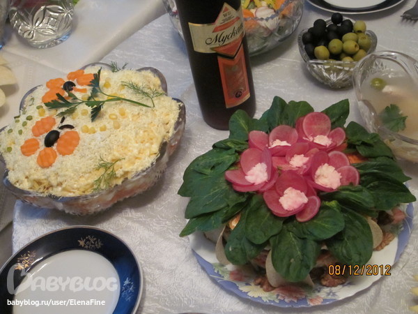 Этот салат или скорей оформление салата называется "Фиалка", я его первый раз делала ( листья - шпинат, цветы - подкрашеная свекольным соком или соком красной капусты редиска, в серединке у меня желток с майонезом, чтоб лепестки держались). Сам салатик может быть любым какой нравится, главное чтоб слоёный и достаточно лёгкий (например с присутствием свежих овощей).Для того чтоб салат стоял я брала форму для выпечки, которая из 2 частей(дно и боковина на застёжке),делала с вечера чтоб пропитался и зафиксировался, бока можно обложить солёными крекерами, чипсами,обсыпать дроблёными орешками, зависит от фантазии и предпочтения. Съедается с удовольствием и полностью, листья идут на ура,у меня все старались брать чтоб обязательно с листочком, потому что шпинат очень полезный))