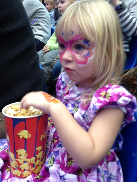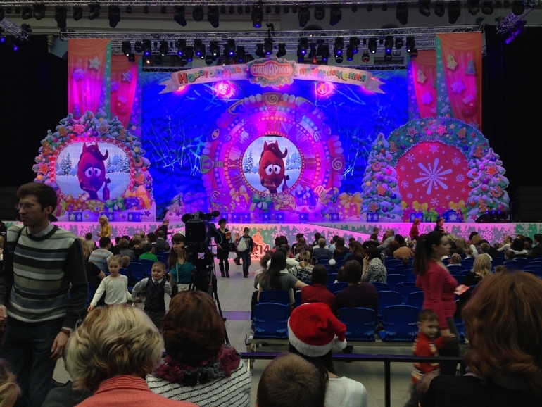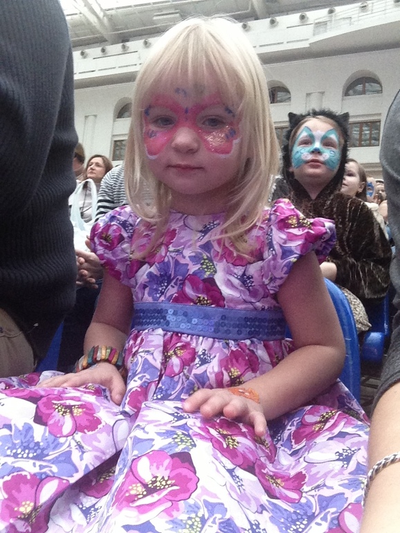 Мы с Машей получили билеты на "Смешариков" в Гостиный Двор на 2 января. Туда нас отвозил муж на машине. Пробка единственная была на Ильинке перед Гостиным Двором, в остальном дороги 2 января - это сказка. Зашли мы в Гостиный Двор, разделись и попали на базар-вокзал с ненормальными ценами. Аквагрим 500 рублей, переводка-смешарик на руку - 100 рублей, попкорн -250, сладкая вата - 500, малюсенькая корона на голову - 500. Как-то так. Наш папа зашел с нами, и пока я сдавала одежду в гардероб, он уже усадил Машу за столик аквагримерши. После бабочки на лице за 500 р. Нам предложили корону еще за 500 и переводку. Папа наш был согласен на все, но корона на жиденькие Машины волосы не крепилась категорически, хотя девушка гримерша очень старалась ее туда вставить, пришлось от короны отказаться. Тогда она приложила две переводки Маше на руки. Приложила и спрашивает: "одну или две делаем?", я говорю: "одну", она головой кивнула, губку схватила и давай обе переводки по очереди тереть)) Я смотрю, улыбаюсь. Говорю: "Девушка, вы же слышали, я сказала - одну. Зачем вы две лепите?". Она засмущалась, занервничала, говорит:"ну что же я сделаю, я же уже наклеила"))) Эх. Не люблю такой навязчивый сервис. Самое противное было, когда шли мальчики с папой мимо этих гримерш и они зазывали детей: "Хотите маску бэтмена? Нет? Тогда спайдермена?". Ну чересчур навязчиво это все там. Вспомнила елку в театре на Перовской совсем без торговли, хорошо там)