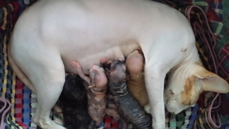 2 дня назад моя сфинксиха родила нам 5 котят. 4 девочки и 1 мальчик)))