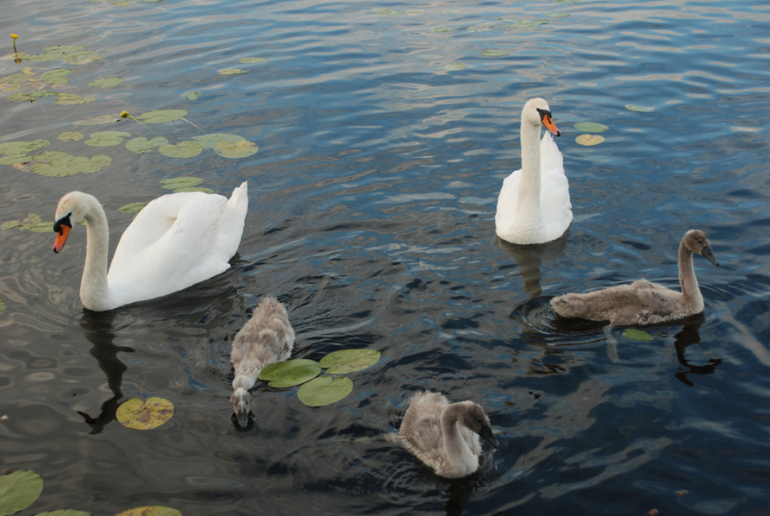 Несколько раз к нам приплывали лебеди. Кормить их интересно, но близко лучше не подходить. Лебединый папаша страшно шипел и грозился клюнуть любого, кто приблизится к его детям.