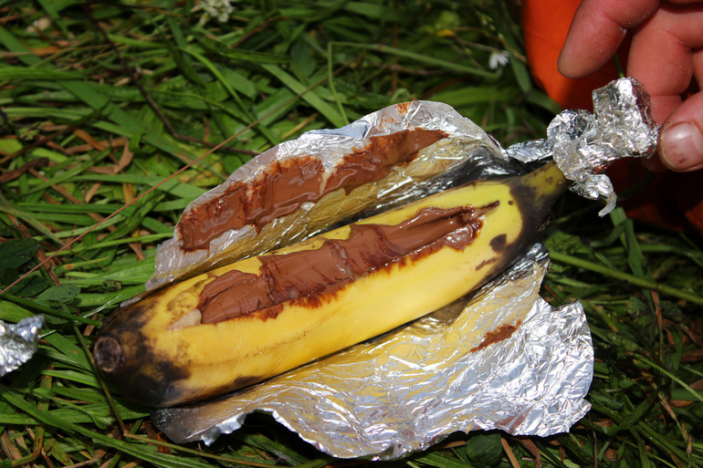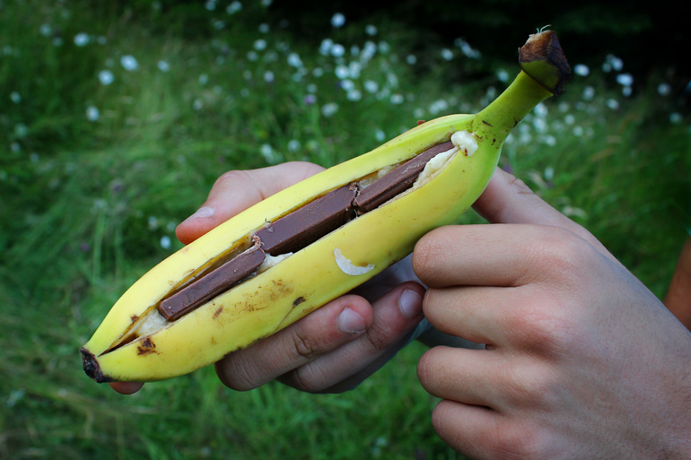 Вообщем решила идти к сердцу через желудок Шашлык там на горе?(мы отдыхали в Карпатах) Сама не осилю. сосиски? Не знаю какие они там в глуши и привлекут ли ее тоже не знала. Придумала испечь бананы с шоколадом, о которых раньше слышала. Для нас что-то новенькое. Она согласилась с радостью. Ура!