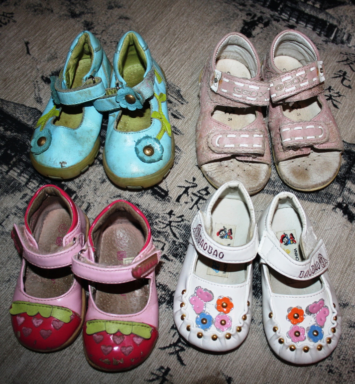 Обувь на девочку, с 19 по 24 размер. Нам отдали б/у, кроме самых маленьких розовых мы ничего не носили сами... Состояние сами видите... Для дачи, я думаю, подойдёт. Белые почти новые.