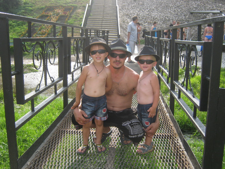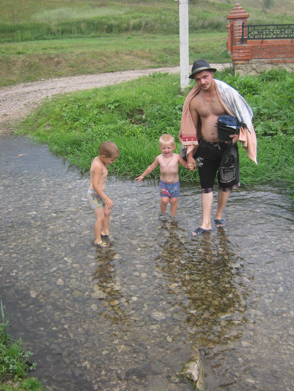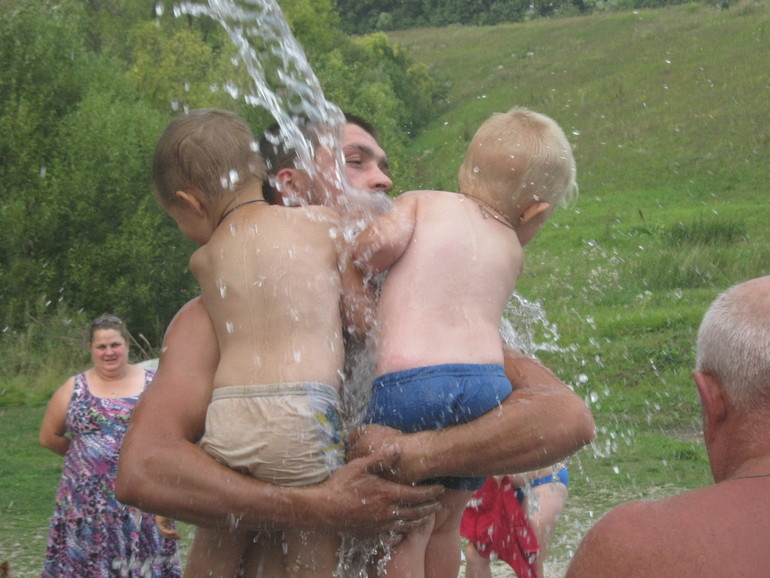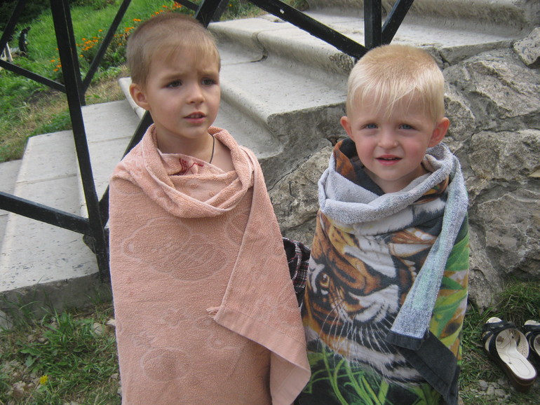 Мальчишки с мужем окунулись три раза. Хотя вода там просто ледяная, и я честно очень сомневалась, что Кириллу понравится (на счёт Мишки не было сомнений - он у нас известный лягушонок).