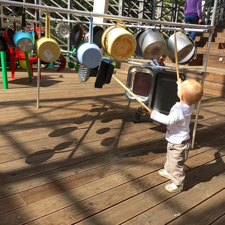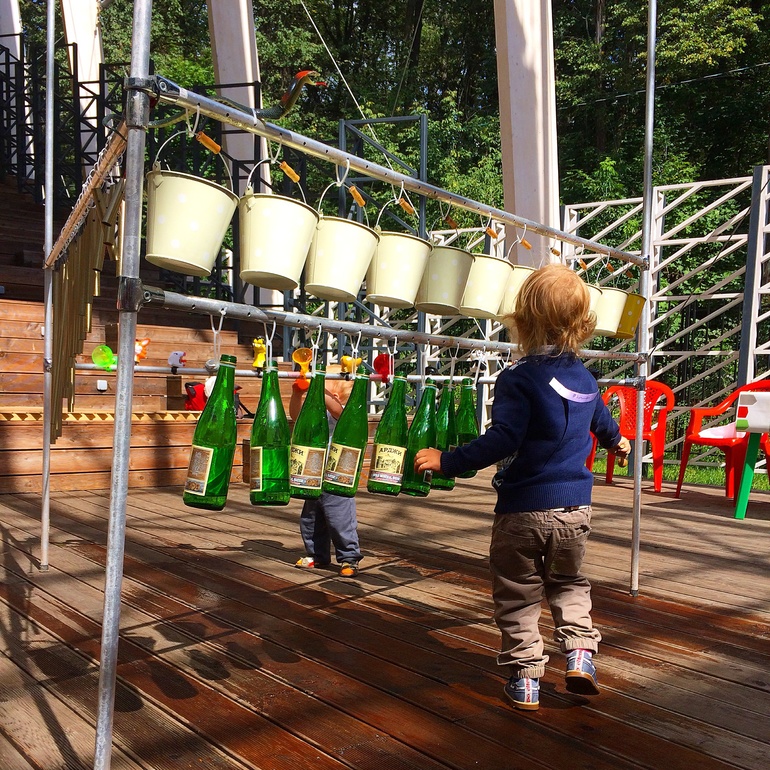 Поэтому я повздыхала и отправились мы шуметь кастрюлями! В летнем кинотеатре для детей организовали шумелки. Были развешаны кастрюли и сковородки, протвини, бутылки и ведра с водой. И по все у этому можно стучать и бить что есть силы. Это детям понравилось больше!))))