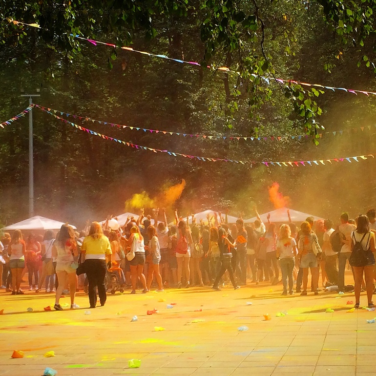 Отдых многодетных семейВчера ездила первый раз в филевский парк с малышней. Старший гостит на даче у крестной. Но мне очень жаль, что он не попал с нам . Думаю он был бы в восторге! Как мы только приехали я сразу поняла, что там намечается какое-то мероприятие. Когда мы дошли до сцены я поняла, что попали мы на фестевсль красок!!! Молодеж бегала все разноцветная и веселая. Мне так хотелось пойти к ним)))) Но сын был категарически против.