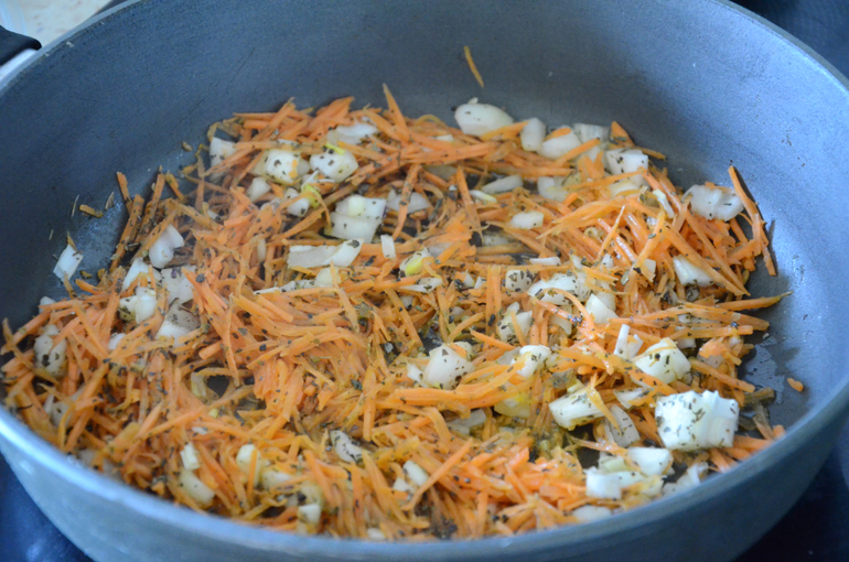 2) Пока варится фасоль, мы тушим на сковородке нарезанную морковь и лук тоже до полуготовности (тушим на растительном масле с добавлением воды), добавляем соль, специи (я добавляю обычно прованские травы - лучше орегано и базилик).