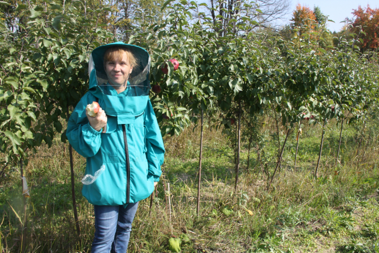 муж же мой теперь и пчеловод:) в саду - пчелы, я и спряталась, но яблочки надо было продегустировать:) самое вкусное - белорусское сладкое:)