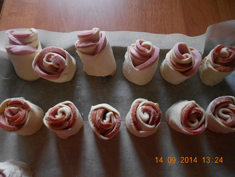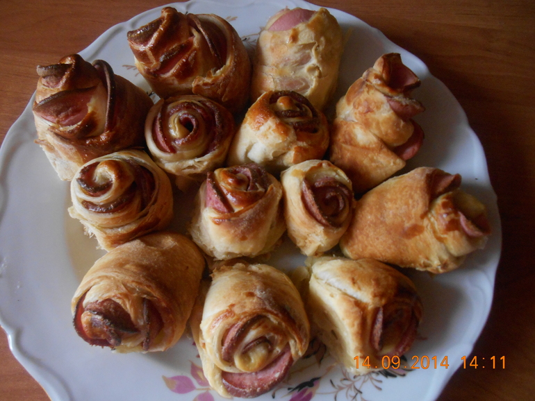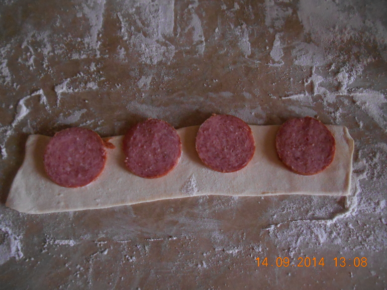 Рецепт под катом. Берем слоеное тесто,режем на полоски,чуть раскатываем,выкладываем колбаску,сворачиваем рулетиком.