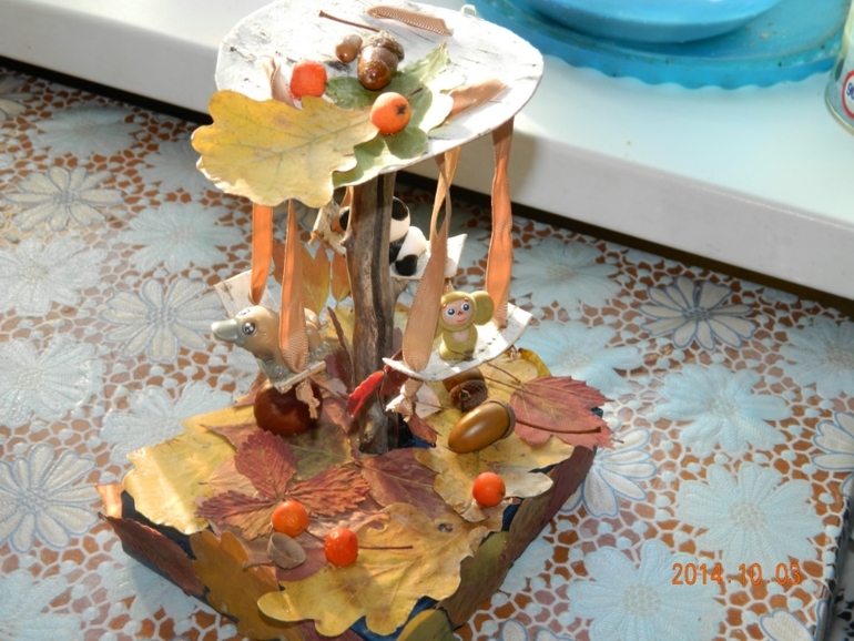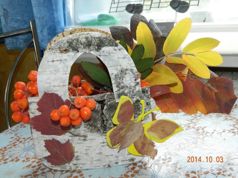 а это лукошко, наполнили шишками, желубями и ккаштанами, вставили рябинку и листочки.