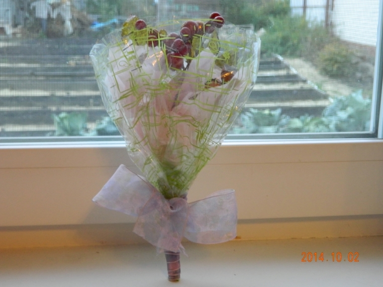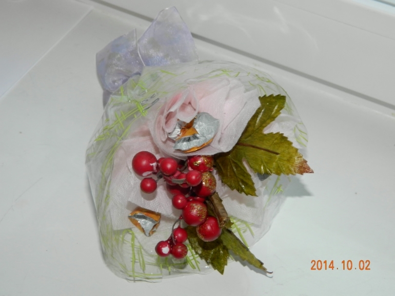 А потом, уже после всеобщего отбоя, решила я себя попробовать в сотворении букета из конфет! у меня же мама-учитель, вот ей Настенка и подарила сегодня мое творчество!!!