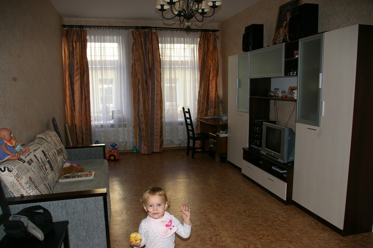 Наша комната, а то ее фото еще не было. Нам тоже стулья, обычные деревянные, докупили. А то даже гостей сажать некуда:) В ней еще будет стоять мое пианино, торшер и пальма:) Не успели еще перевезти.