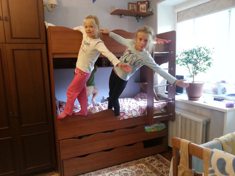 В общем кроватка нам очень нравится, у девочек получилось по своей мини комнатке, где можно уединиться, а старший сын без проблем сам выдвигает свою кроватку, когда приходит время ложится спать. Можно было бы еще много писать про то, какая она уютная и замечательная, но времени, к сожалению совсем нет, уже два месяца у нас наша кроватка, и меня уже совесть замучила, что никак не напишу слова благодарности ребятам, которые с душой выполняют свою работу!