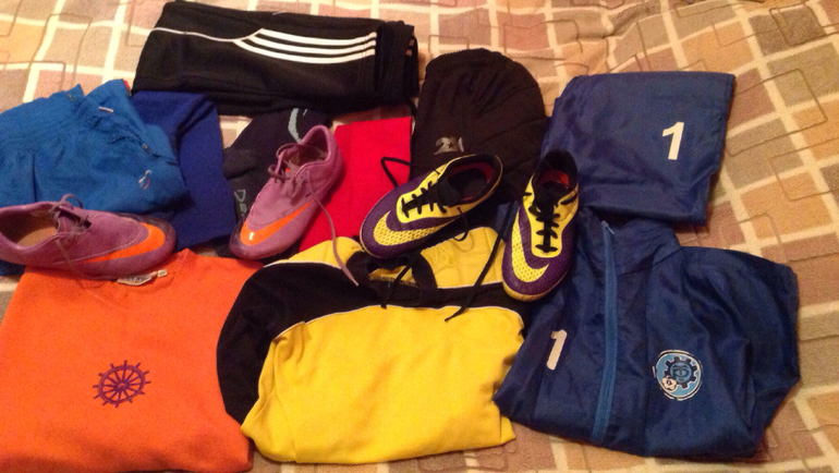 Толстовка, спортивные штаны - 3 шт , гетры- 3 шт не промокаемый костюм , ветровки и штаны ( штаны новые ) бутсы размер фиолетовые 35.5 , жёлтые - 36,5 , шапка и форма жёлтая всё в нормальном состоянии , носиться в футбол ещё можно в этой форме долго !!))) есть Вратарские перчатки если нужны кому !))