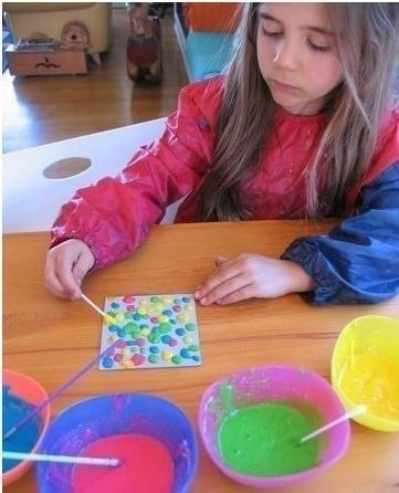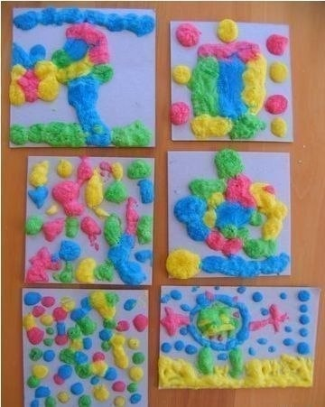 Наносить краску удобно на плотную бумагу или картон толстой кистью. Можно использовать вместо кисти ватные палочки.