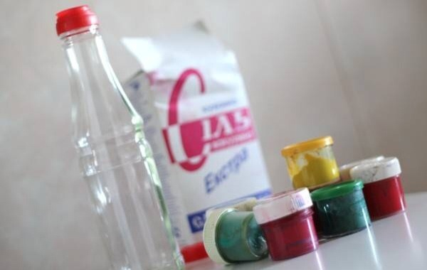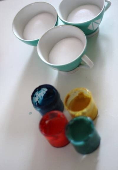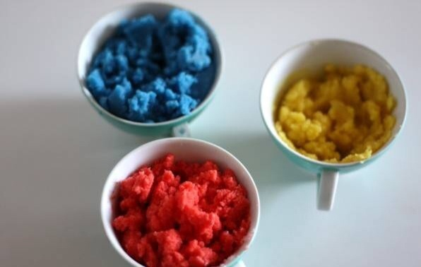 В небольшие ёмкости (чашечки, баночки) насыпать соли. В каждую ёмкость влить окрашенную определённым цветом воду. Интенсивность цвета будет зависеть от пропорций краски и воды: больше воды - бледный цвет, больше краски - яркий цвет.