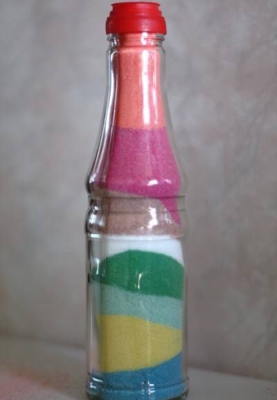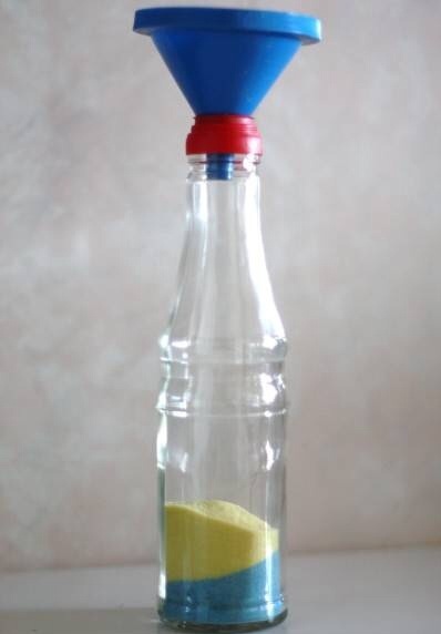 Засыпать соль в бутылку удобно с помощью лейки. Для эффекта волн бутылку наклонять в разные стороны. Ширина слоёв произвольная, так же как и последовательность цветов. Полную бутылку нужно стукнуть о стол несколько раз, чтобы соль утрамбовалась. Затем досыпать до самого горлышка и закрыть крышкой.