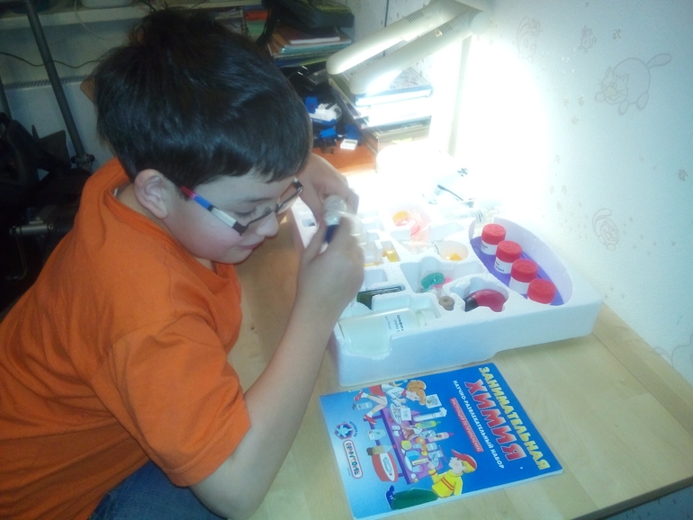 А ещё мы выиграли в розыгрыше "Два замечательных подарка к Новому году", который устраивала Кира вместе с сыном. Даже не к новому году, а к своему дню рождения мой младший сын получил чудесный подарок - набор "Занимательная химия". Сын - большой любитель химии, хотя предмета такого в школе у него ещё нет.