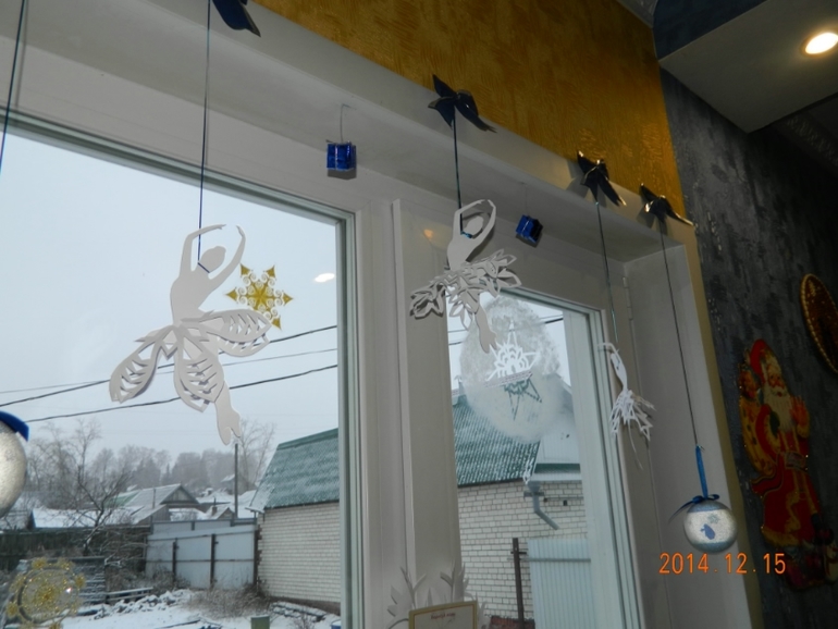 вот такое красивое окошко у нас, все в новогоднем настроении!!! Ах, да, чуть не забыла! Еще мы опробовали на окошке сделать снежинки-отпечатки зубной пастой, на фотографии с балеринками можно увидеть такую снежинку.