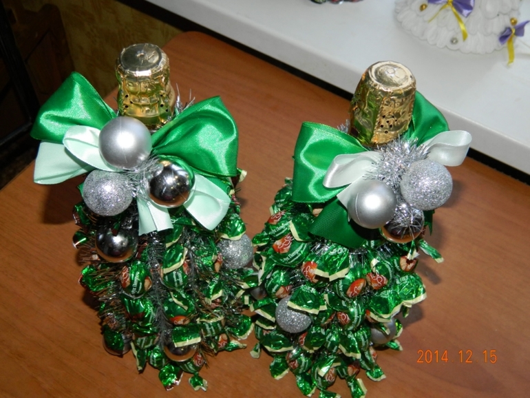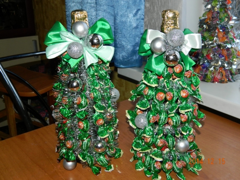 А это подарки для родителей-конфетная елочка на бутылке шампанского! все интереснее дарить ее, чем просто отдельно бутылку и коробку конфет, правда ведь?