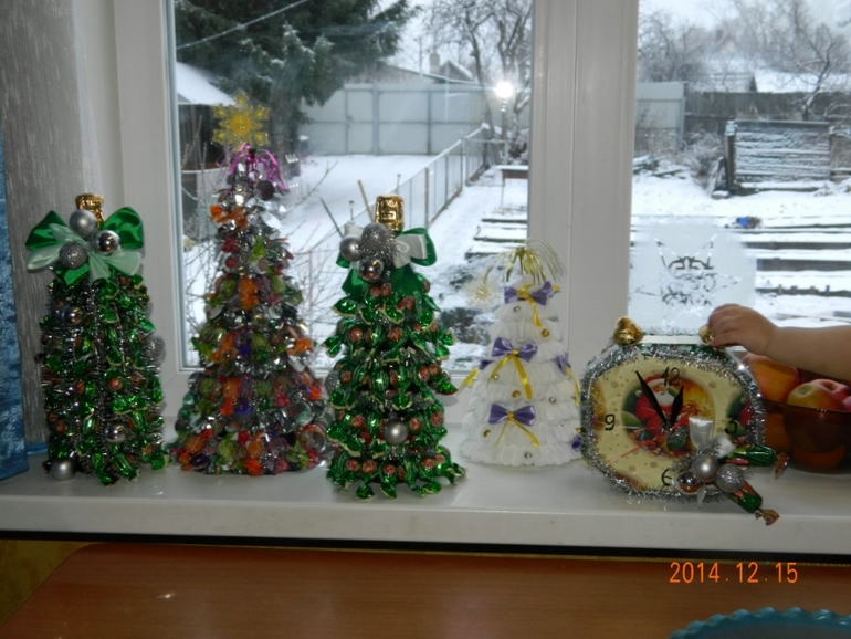 ну, а это елочки! Одна из конфеток, другая из ватных дисков, Моего участия в них нет вовсе!!! Только руководство процессом!!!