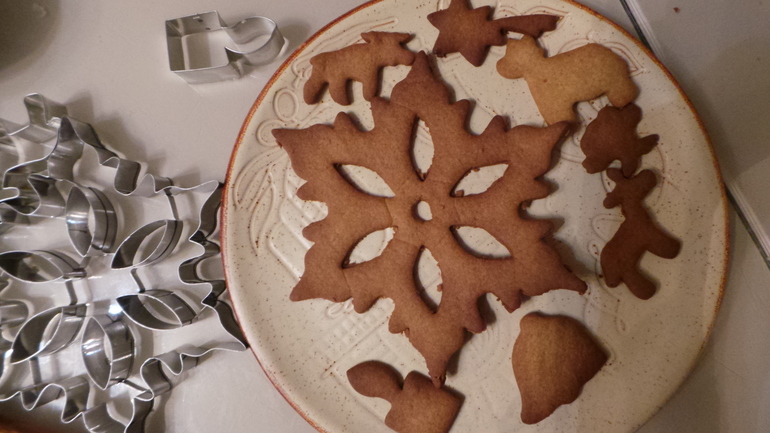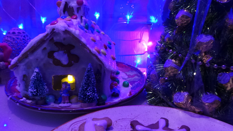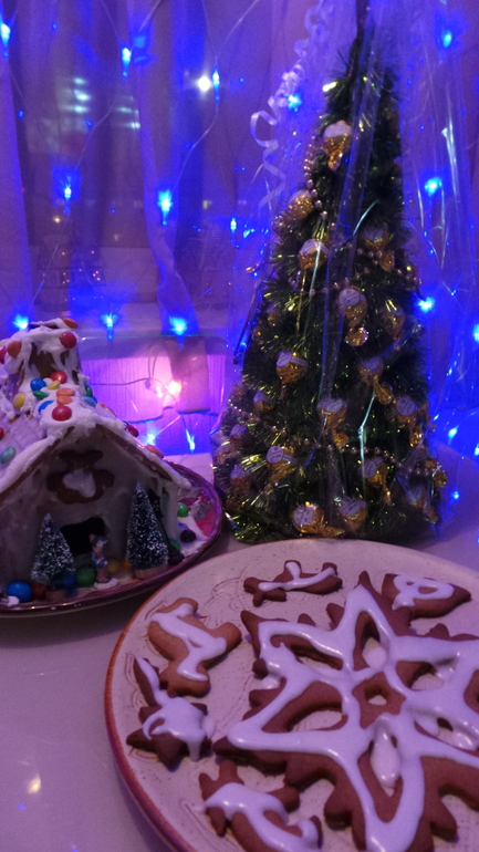 мы тоже в этом году и домик, и елочку, и печеньки делали)) Как и у тебя, половина украшений попадала в ротик))! 31го домик стоял красивый, а печеньки все весели на улочке! запах стоял — шикарный!!! Но с 1го числа и украшения с домика и печеньки с елочка стали "исчезать", только веревочки остались