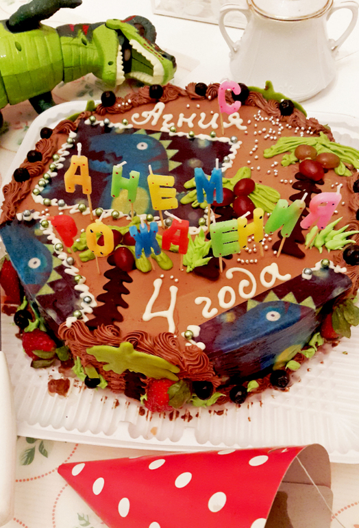 Тортик заказываю у знакомой. Мастика не нравиться. А этот был огромный, но такой вкусный. Картинка распечатана на съедобной бумаге. Агния любит динозавров.