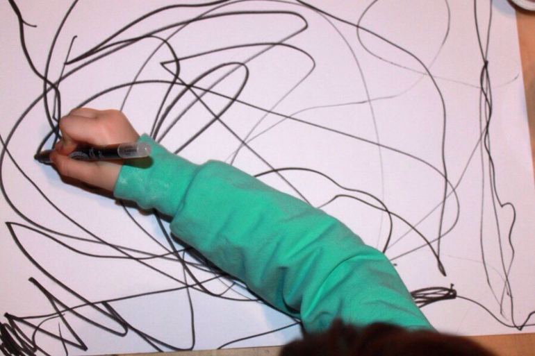 Просим ребенка зарисовать линиями, кружками, зигзагами лист, не отрывая ручки от бумаги. Можете включить в этот момент музыку под настроение. Можно даже попросить нарисовать эту музыку. Проследите, чтобы ручка малыша "не застревала" на одном месте, не мельтешила и не протирала дыру в бумаге.