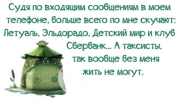 А меня таксисты просто обожают. а главное , что я на такси нкуда никогда не ездила big_smiles_162.gif в эльдарадо купила единожды телефон, теперь смсмесят меня еженедельно)