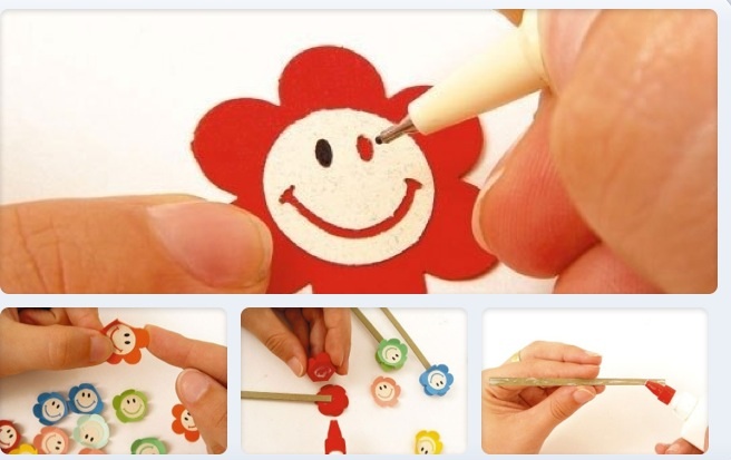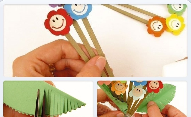 Вам понадобится: плотная цветная бумага, белый картон, коробка из-под яиц, палочки для мороженого (7 штук), зеленый пластилин, зеленая и белая краска, клей ПВА, ножницы, кисти для клея и краски.