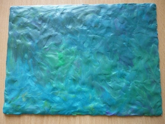 1. В качестве основы для картины можно использовать не только картон, но и деревянную или пластиковую дощечку. Главное, чтобы на эту основу хорошо приклеивался пластилин. Бруски пластилина разных оттенков синего и зеленого цветов разомните и смешайте для получения фона будущей картины.