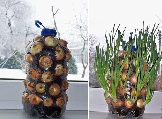 Берёте бутылку ,Наполняете бутылку почвой по уровень первых отверстий под лук, Посадите лук в бутылку так, чтобы точка роста выглядывала в отверстия наружу.Насыпте снова земли, по уровень нового ряда «окошек». Опять воткните в грунт луковички. И так повторяйте, пока дойдете до верха емкости. А там можно уже просто посадить лук в бутылку горизонтально.