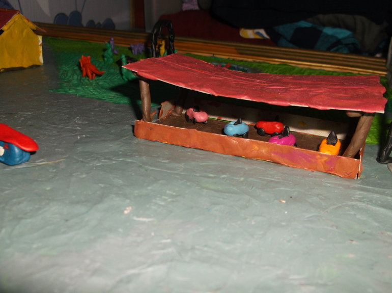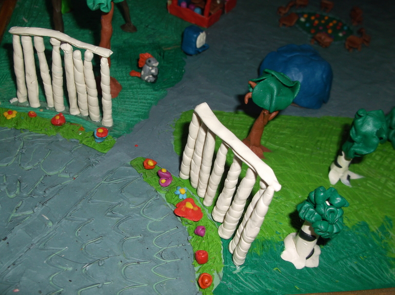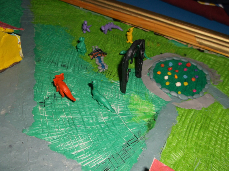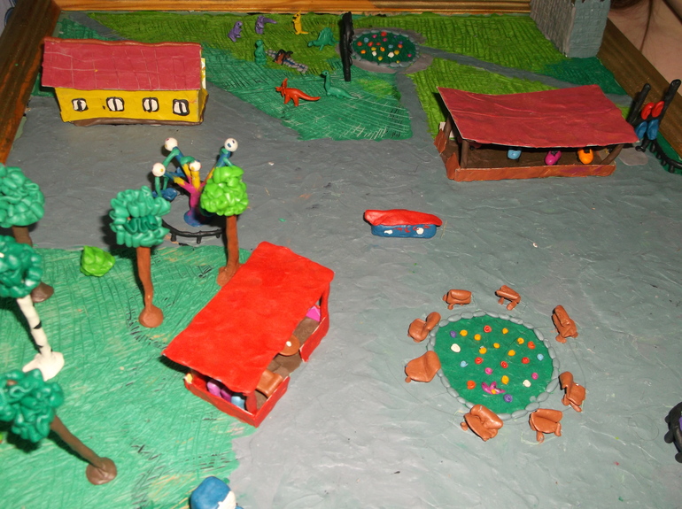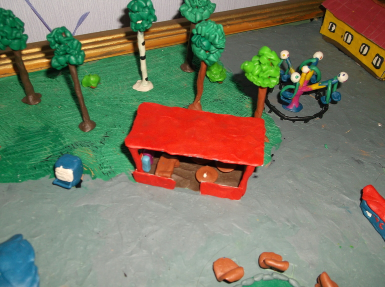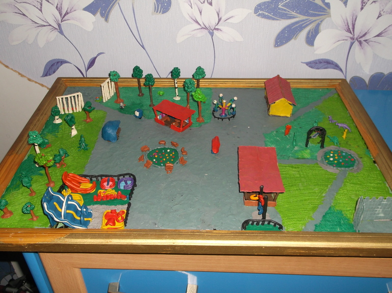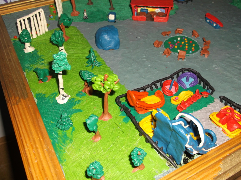 Дали кусок фанерки 40*60 см, на ней и нужно было делать. Ну что делать, купили 2 пачки пластилина, распечатали из яндекса карту, открыли фотографии и стали соображать)))) Нужно сказать, что дочка из пластилина лепить очень любит, лепит все очень мелкое, чуть ли не с лупой ее поделки надо рассматривать))) В этом я ей не помогала, она все сама.
