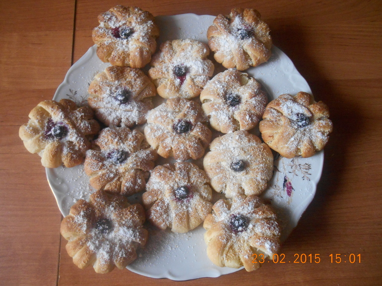 Берем колечко и обворачиваем его полосочкой вокруг.По середине делаем углубление,кладем ягодку (но это не обязательно).Сверху смазать взбитым яйцом,посыпать кокосовой стружкой и в духовку при 180 гр на 20 мин.