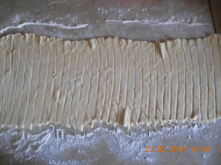 Рецепт под кат Берем слоеное тесто и консервированные кольца ананасов.Тесто немного раскатать,разрезать на полоски по 1 см примерно.