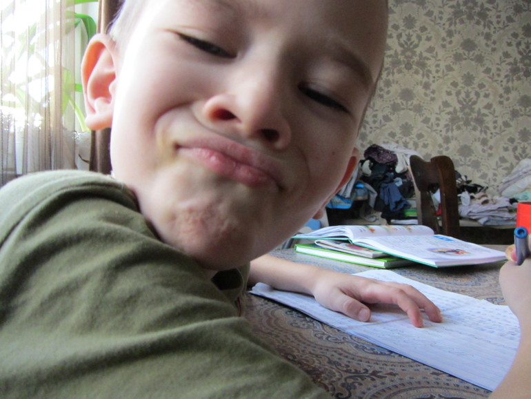 Ой, младший у вас прикольщик. Обояшки оба. Мы тоже так учим, две минуты пишет три в окошко смотрит. При этом приплясывая, пританцовывая.