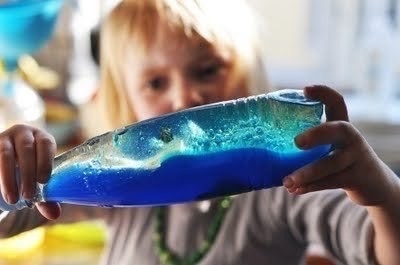 Понадобится прозрачная пластиковая бутылка, наполненная на 1/3 водой, подкрашенная голубым пищевым красителем. Остальные 2/3 бутылки наливаем подсолнечное или другое растительное масло.